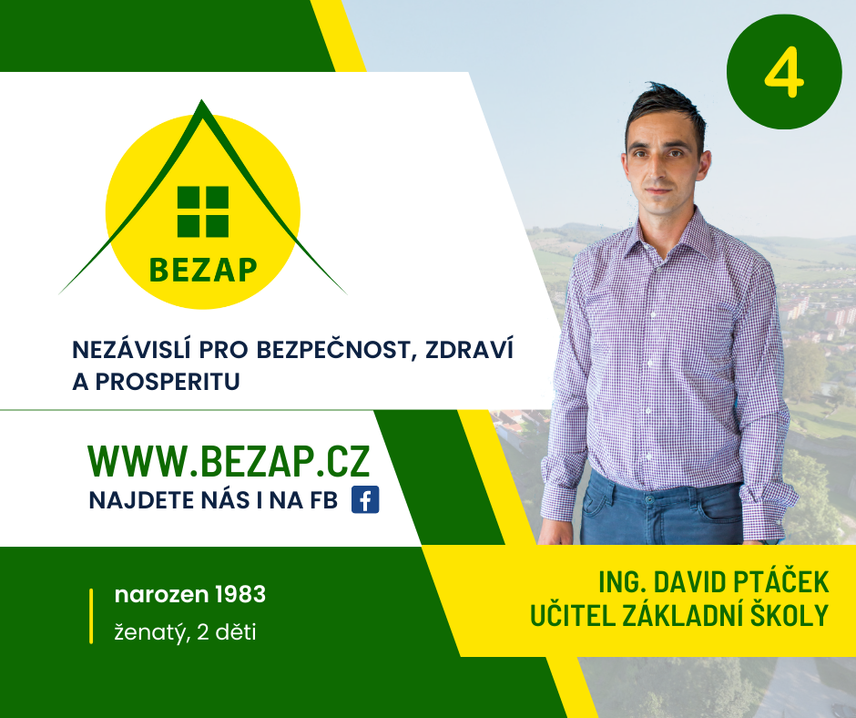 Jmenuji se David Ptáček, je mi 38 let, jsem ženatý, mám dvě děti a bydlím v rodinném domě v Brumově - Bylnici, kde jsem zároveň chodil do základní školy. Vystudoval jsem Sportovní management na Vysoké škole Báňské - Technické univerzitě v Ostravě. Od roku 2009 pracuji jako učitel na základní škole ve Slavičíně, jsem členem školské rady. Věnuji se zde také trenérské činnosti mládežnických fotbalových týmů. Mezi mé zájmy patří sport, práce kolem domu a rodinné výlety s dětmi.